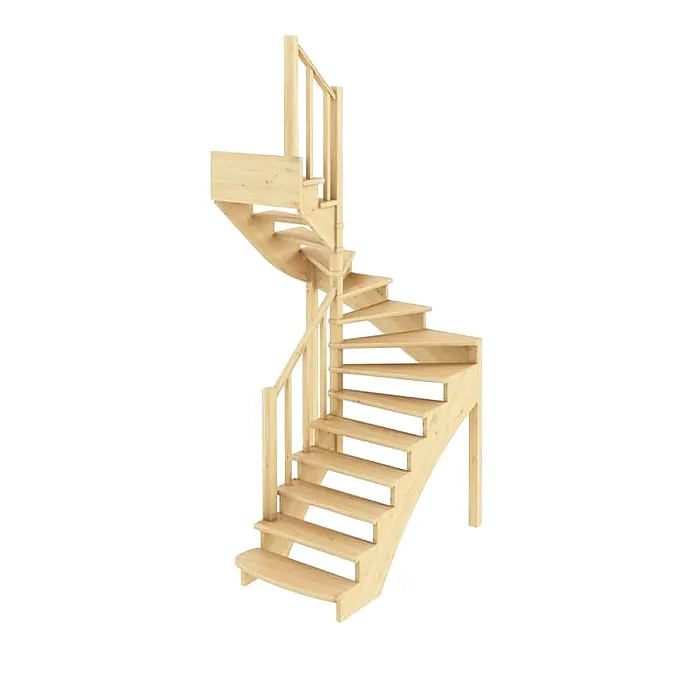 Удобная поворотная лестница на второй этаж. Дополнительные ограждения по первому маршу обеспечивают безопасность при подъеме и спуске, кроме того, небольшой угол подъема открывает всю площадь ступеней. Монтаж осуществляется силами двух человек на объекте по указаниям, приведенным в паспорте на лестницу.