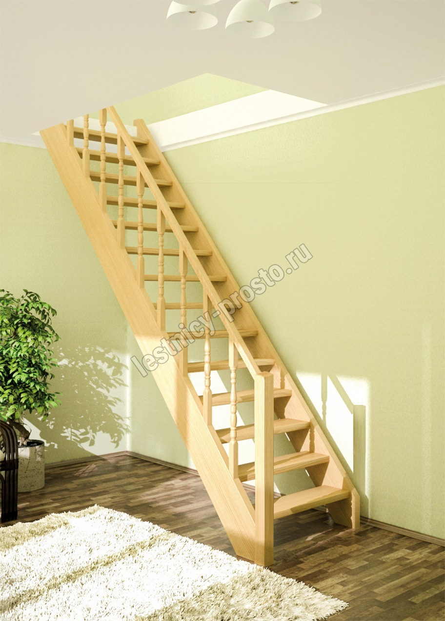 Базовый комплект включает в себя деревянные элементы лестницы и ограждения без какого-либо покрытия. Ограждение монтируется с любой стороны. Дополнительно к этой лестнице можно установить пристенные поручни ( в базовый комплект не входят)