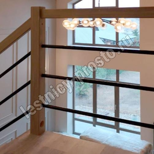 В комплекте: 3 прямых столба и профильный поручень без покрытия, комплект из 3 ригелей из стали (окрашены в цвет каркаса или хром по желанию) диаметром 12 мм. Ограждение начинается со второй ступени.