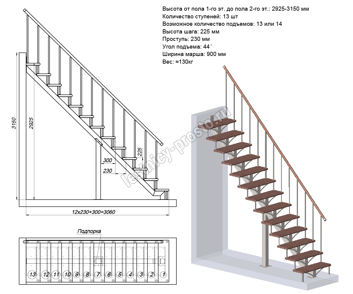 Лестница PROSTO MONO прямая, h315 см, ступени хвоя