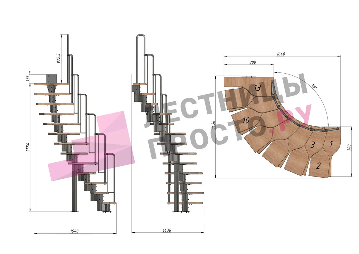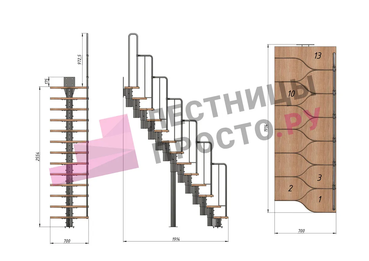 | Лестница Prosto Urban Black гусиный шаг 700 мм, h216-312 см (12 ступеней), бук |