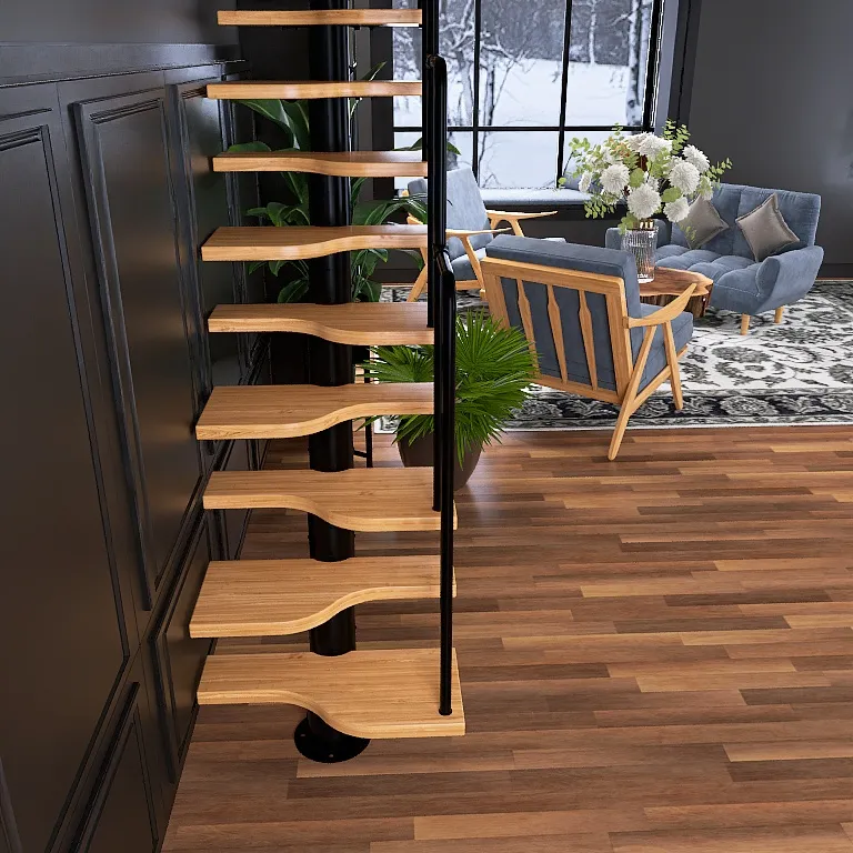 Новинка 2021 года !!! Не имеет аналогов в России по своему надежному конструктиву среди винтовых лестниц. Используемый материал - древесина шлифованная , не окрашенная и металл покрытый порошковой краской. Поручень - пластиковый, уже изогнутый. Цвет поручня в ассортименте.