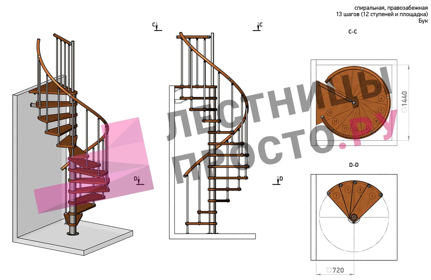 Правая, d=140см, 12 ступеней + площадка