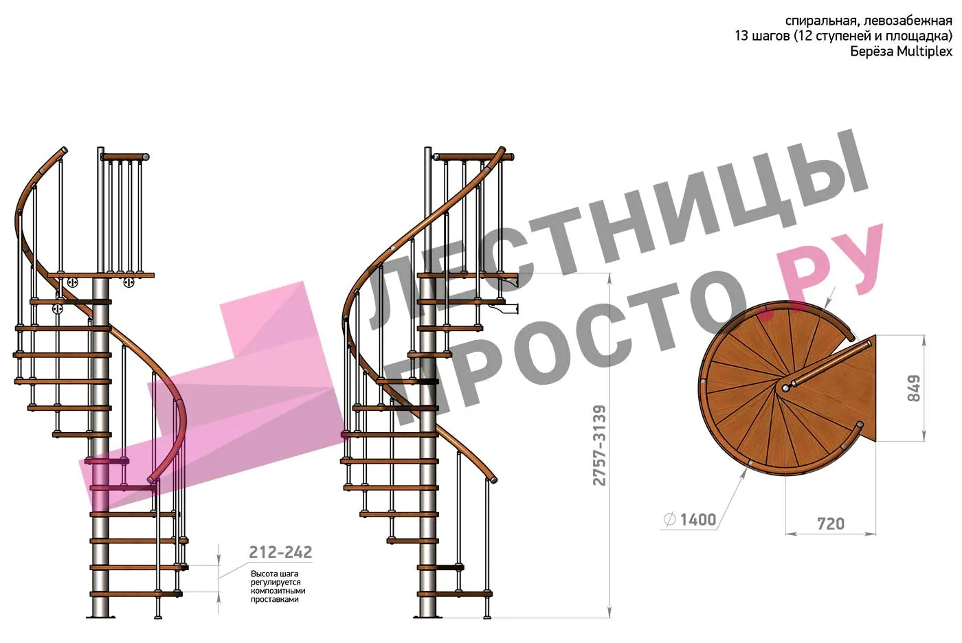 Высота ступеней регулируется с шагом 3 мм. в пределах 210-231 мм., благодаря чему, лестница прекрасно подгоняется под необходимую высоту.