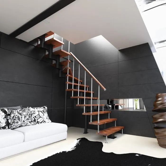 Компактная надёжная лестница. Ступени толщиной 30 мм, изготовлены из массива берёзы по технологии Multiplex, лакированные. Все металлические части оцинкованы, горячим способом и покрыты порошковой краской - черного цвета; Лестница имеет надёжную несущую стальную конструкцию.