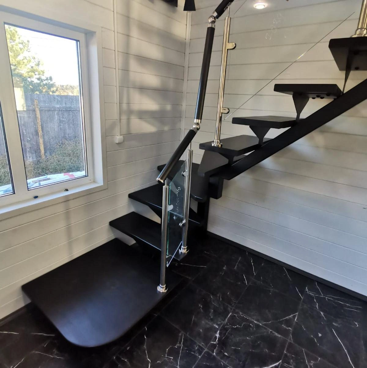 Отделка лестницы всегда в черном цвете. Перила из полиуретана с алюминиевым сердечником черного цвета, как и износостойкие нескользящие панели на ступенях.