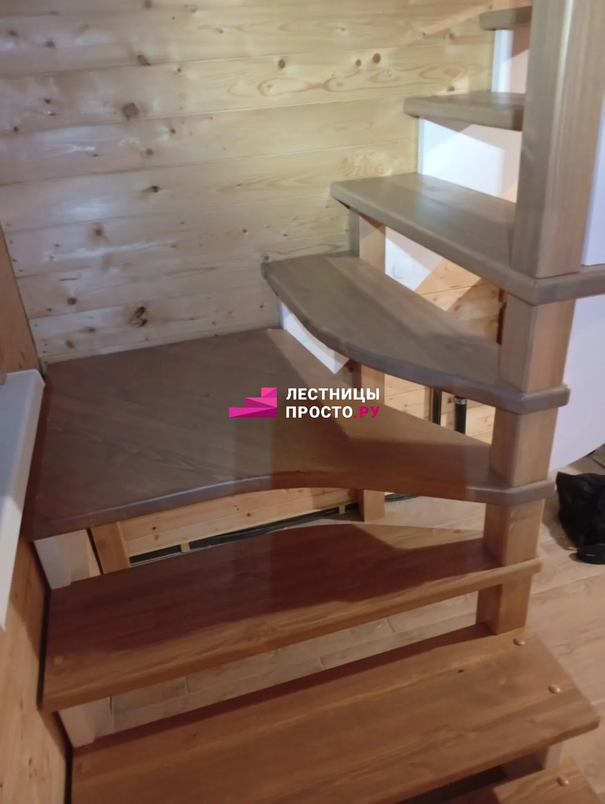 Лестница из сосны с поворотом и подступёнками для частного дома